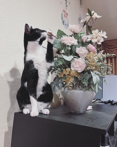A tuxedo stray (once) kitten (now) cat that was dropped off in front of my mail box when she was just three weeks old.